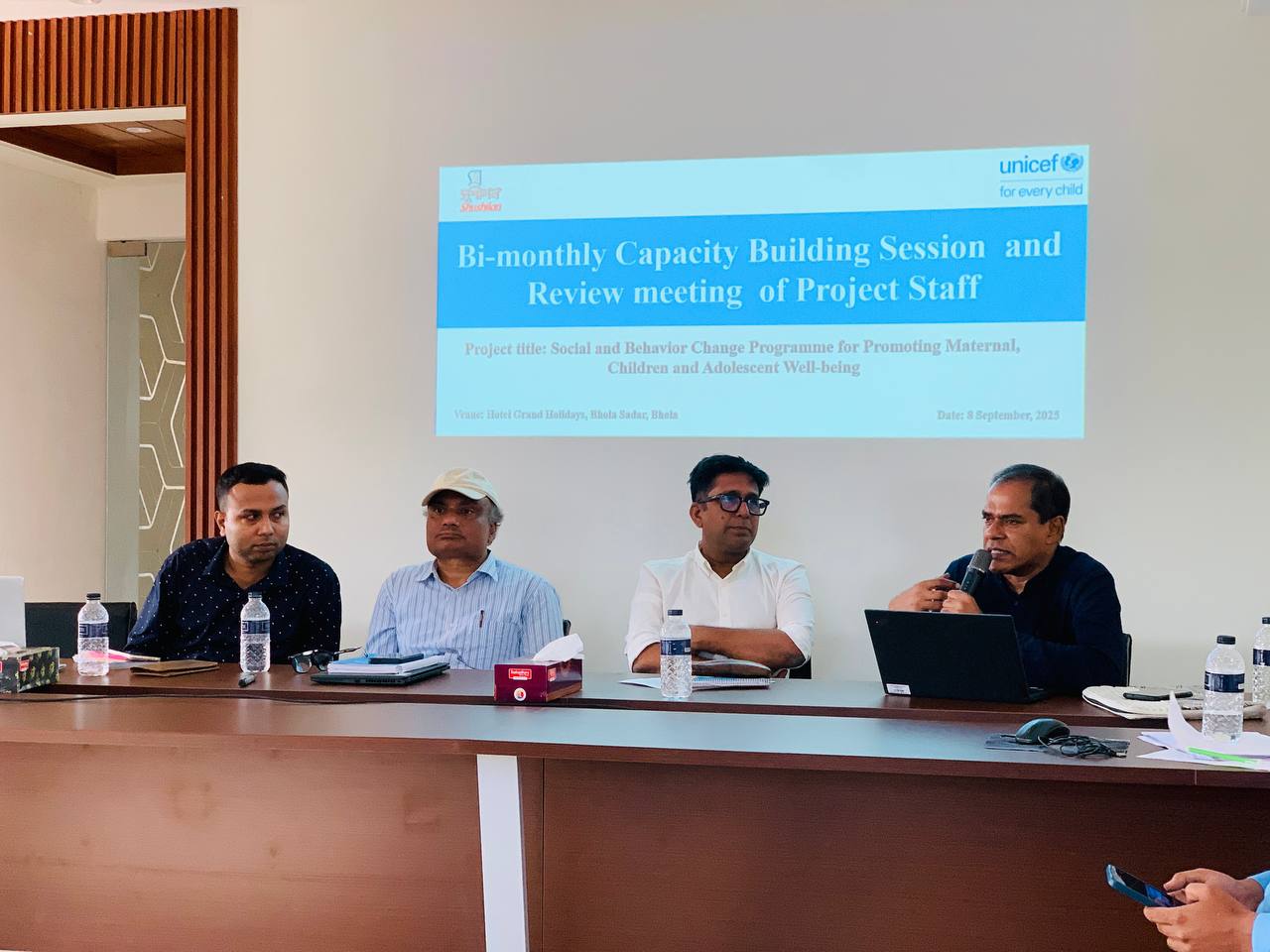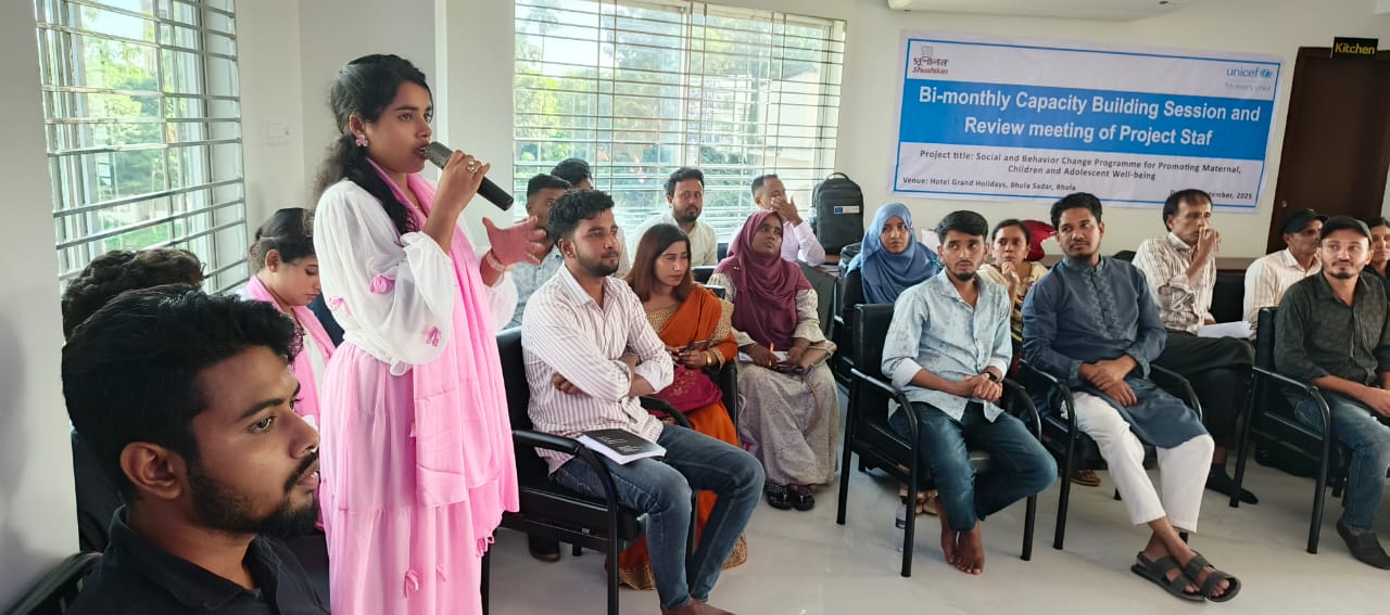 The 11th Bi-monthly Staff Review Meeting of the Social and Behaviour Change (SBC) Programme for Promoting Maternal, Children and Adolescent Well-being-Bhola was held on 8 September 2025 at Hotel Grand Holidays, Bhola. A total of 43 participants including Community Mobilizers, Project Officers, and 3 senior officials from UNICEF Barisal Field Office attended. The UNICEF delegation was led by Mr. Anowar Hossain, Chief Field Officer (CFO).